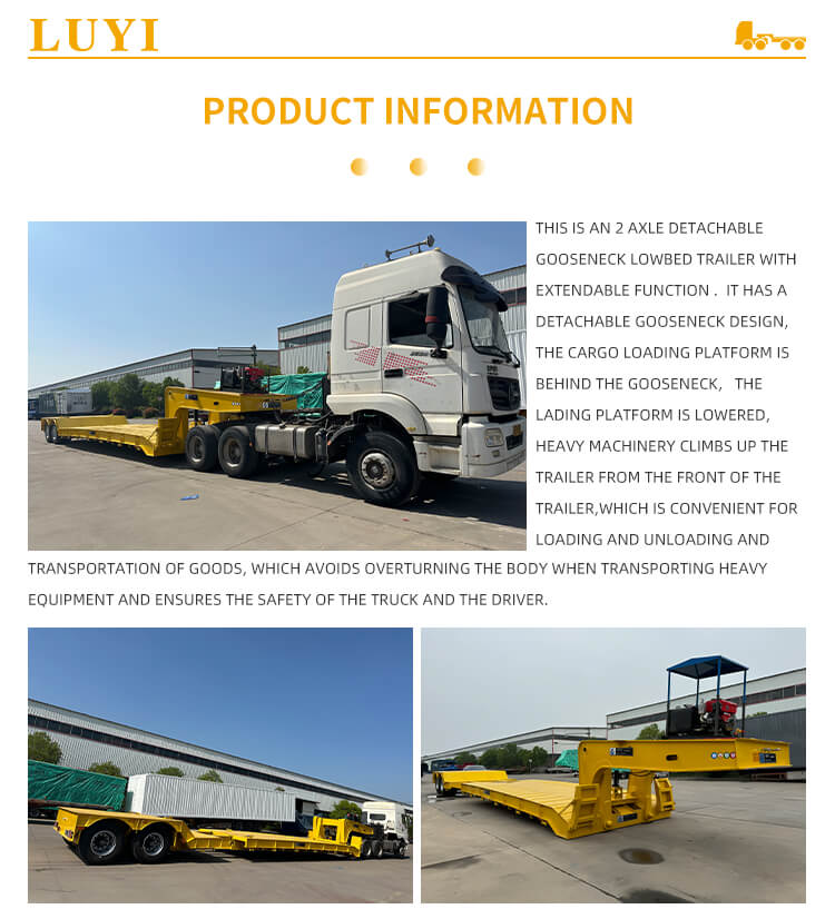 Der aus Shandong, China, stammende Luyi-Detachable Gooseneck Lowboy Trailer ist ein professioneller Sattelauflieger für Schwerlasttransporte. Der aus hochwertigem Kohlenstoffstahl gefertigte Hauptträger besteht aus hochfestem Q345B/ST52-3-Stahl und sorgt so für eine solide und langlebige Struktur. Mit den Maßen 12.000 mm × 2.500 mm × 1.650 mm eignet es sich für verschiedene Arbeitsszenarien.