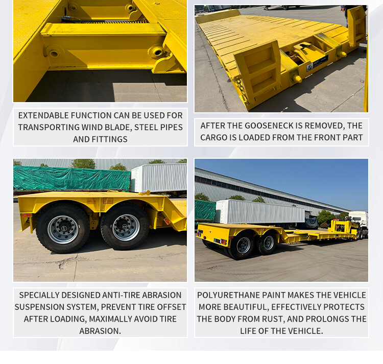 Ausgestattet mit 13-Tonnen-Achsen von Marken wie BPW, Fuwa oder CIMC bietet er optional mechanische Feder- oder Luftfedersysteme, gepaart mit 12R22,5-Reifen für hohe Fahrstabilität und eine maximale Nutzlast von 120 Tonnen. Es ist mit 28-Tonnen-Landebeinen von JOST, Fuwa oder Yahua und optionalen 90#- oder 50#-Kingpins ausgestattet, was eine stabile Verbindung und hohe Anpassungsfähigkeit gewährleistet. Mit anpassbaren Farben wird es aufgrund seines abnehmbaren Schwanenhalsdesigns und seiner robusten Tragfähigkeit zu einer zuverlässigen Wahl für den Schwerlasttransport.