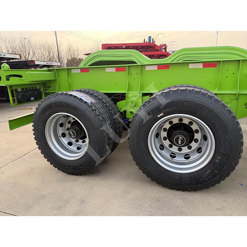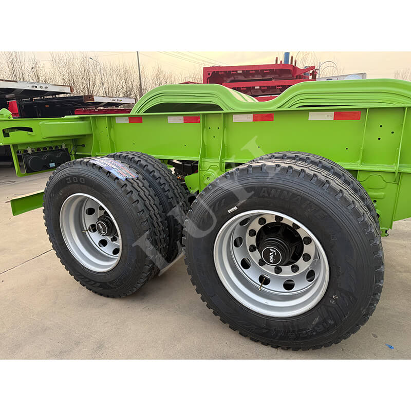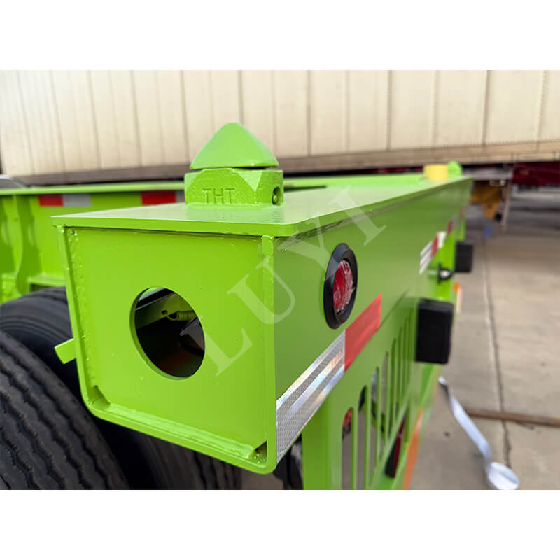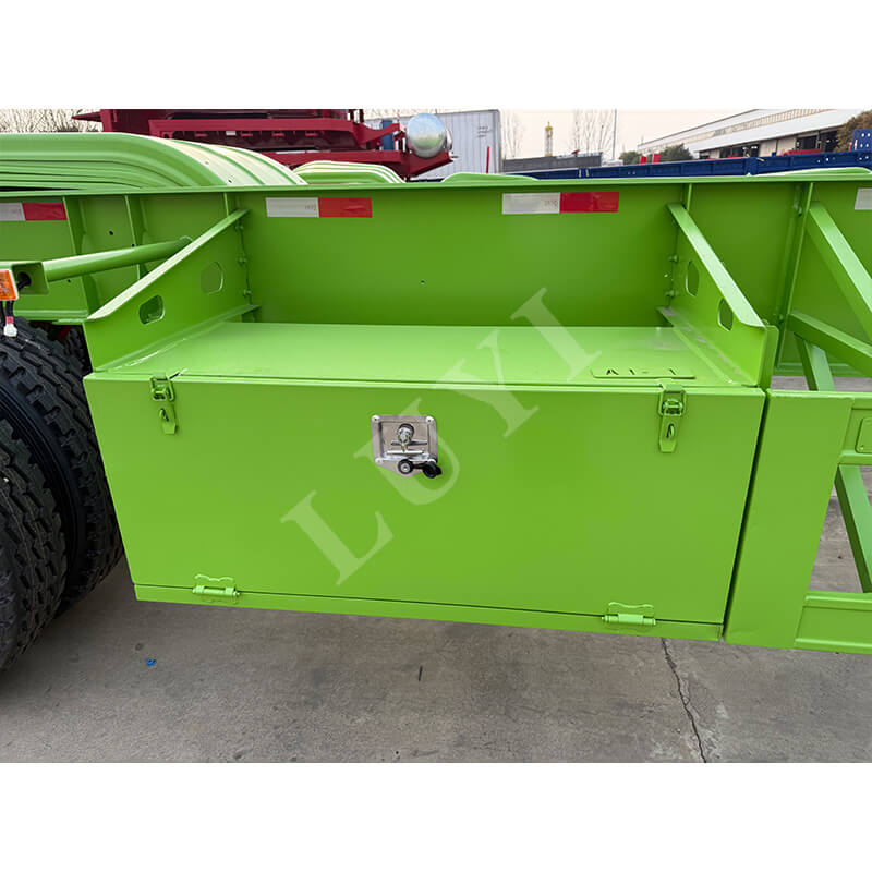 Das Fahrzeug ist aus hochwertigem Stahl gefertigt und zeichnet sich durch eine stabile und langlebige Struktur aus. Es verfügt über eine maximale Nutzlast von 40 Tonnen und ist für den Transport von 20/40-Tonnen-Containern geeignet. Die Karosseriegröße beträgt 14000 x 250 x 1800 mm, ausgestattet mit 2 Achsen der Marke Fuwa und optionaler mechanischer oder Luftfederung, die sowohl Fahrstabilität als auch Stoßdämpfungsleistung bietet. Es ist mit Reifen der Spezifikationen 12R22.5, 12.00R20 und 11R22.5 ausgestattet und passt sich so an unterschiedliche Straßenverhältnisse an. Die 90 mm (Breite) × 13 mm (Dicke) × 10-lagige Blattfeder erhöht die Tragfähigkeit zusätzlich und die serienmäßigen 28-Tonnen-Ausleger sorgen für Parksicherheit.