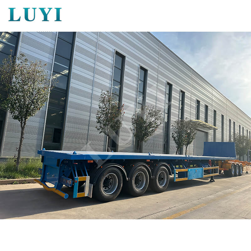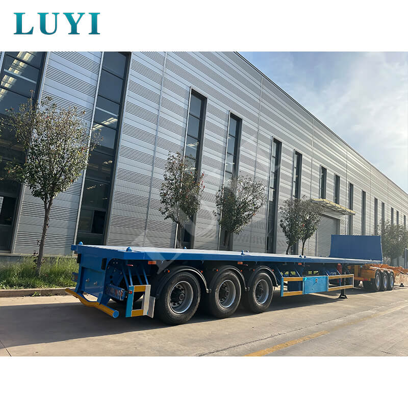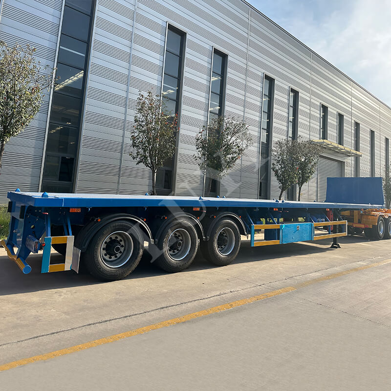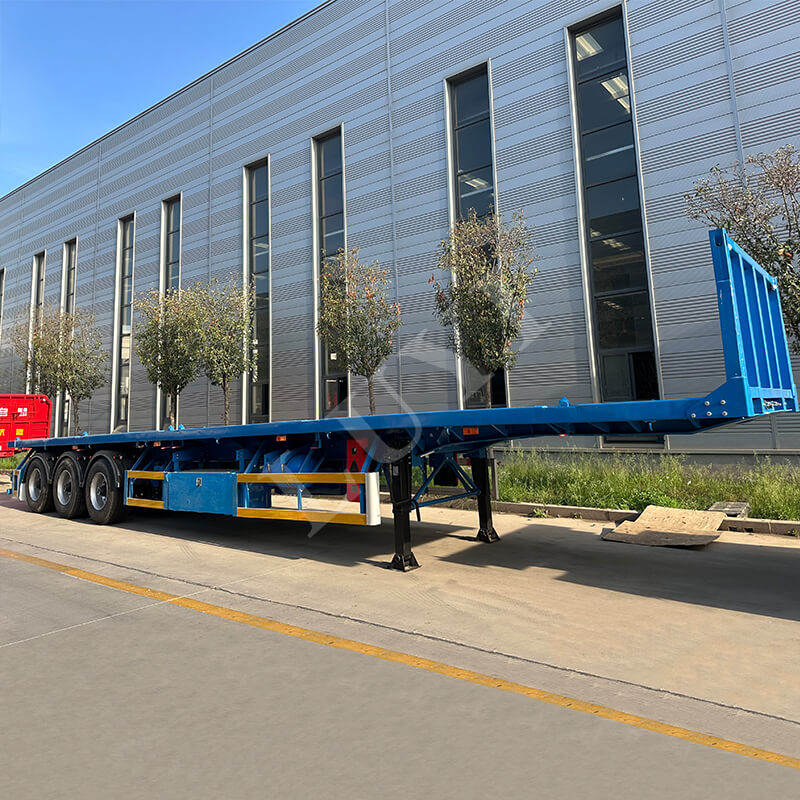 Der 3-achsige 40-Tonnen-Pritschenauflieger ist ein neu konformer Sattelauflieger aus hochfestem Stahl, ausgestattet mit 12 Reifen und zuverlässiger Federung, mit einer 40-Tonnen-Ladekapazität, die für den Schwerlasttransport geeignet ist.