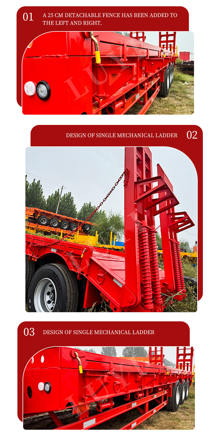 Ausgestattet mit hochwertigen 13T/16T-Achsen (optional von LUYI, BPW oder FUWA) und gepaart mit mechanischen oder Luftfederungssystemen gewährleistet der Anhänger einen stabilen und zuverlässigen Betrieb. Die 10-lagige Blattfeder (90 mm Breite und 13 mm Dicke) garantiert in Kombination mit dem Zweileitungs-Bremssystem eine präzise und effiziente Bremsleistung. Er ist standardmäßig mit einem 28-Tonnen-Fahrwerk und einem 2" (50 mm) oder 3,5" (90 mm) JOST-Königsbolzen ausgestattet, der mit verschiedenen Sattelzugmaschinen kompatibel ist. Mit anpassbaren Farben erfüllt dieser Anhänger perfekt die Transportanforderungen aller Arten von Schwergütern und ist somit die ideale Wahl in der Logistik- und Transportbranche.