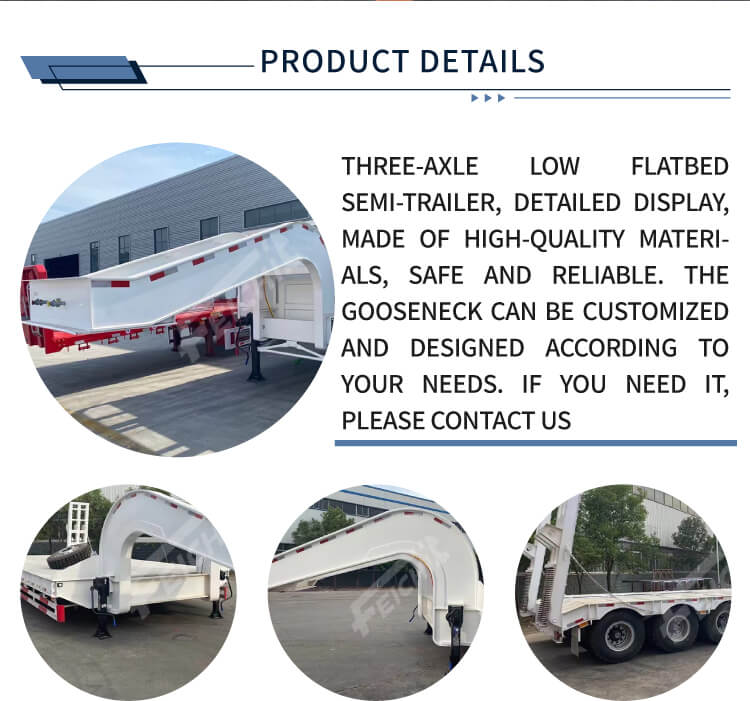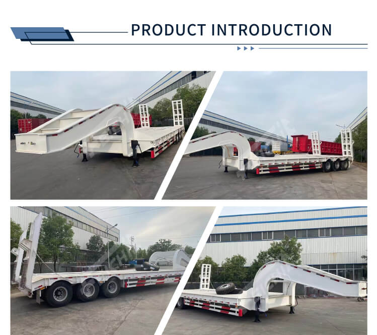 Er ist aus hochwertigem Stahl gefertigt und hat eine Größe von 17.000 x 3.000 x 1.500 mm, was ausreichend Platz für Ladung bietet. Er verfügt über 4 Achsen für eine starke Tragfähigkeit und ist wahlweise mit Luft- oder Blattfederung ausgestattet, um stabiles Fahren und wirksamen Ladungsschutz zu gewährleisten. Das abnehmbare Schwanenhalsdesign erhöht die Beladungsflexibilität, während hydraulische oder manuelle Leiteroptionen das Be- und Entladen schwerer Geräte vereinfachen.