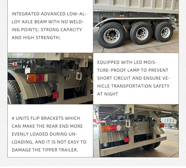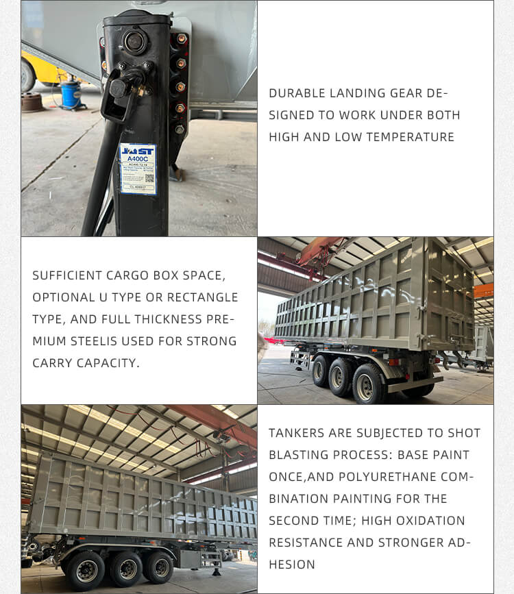 Es bietet flexible Konfigurationen für unterschiedliche Anforderungen: Zu den Achsoptionen gehören 2/3/4 Achsen der bewährten Marken BPW und FUWA sowie Federungsoptionen zwischen mechanischer oder Luftfederung für stabiles Fahren. Ausgestattet mit 12R22,5-Reifen, einem standardmäßigen 28-Tonnen-Fahrwerk und 2" (50 mm)/3,5" (90 mm) JOST-Königsbolzen gewährleistet es eine starke Anpassungsfähigkeit. Das Polyurethan-Lackierungsverfahren erhöht die Haltbarkeit, die Farbe ist anpassbar und die Garantie von sechs Jahren macht es zuverlässig für den Langzeittransport von Sand und Kies.