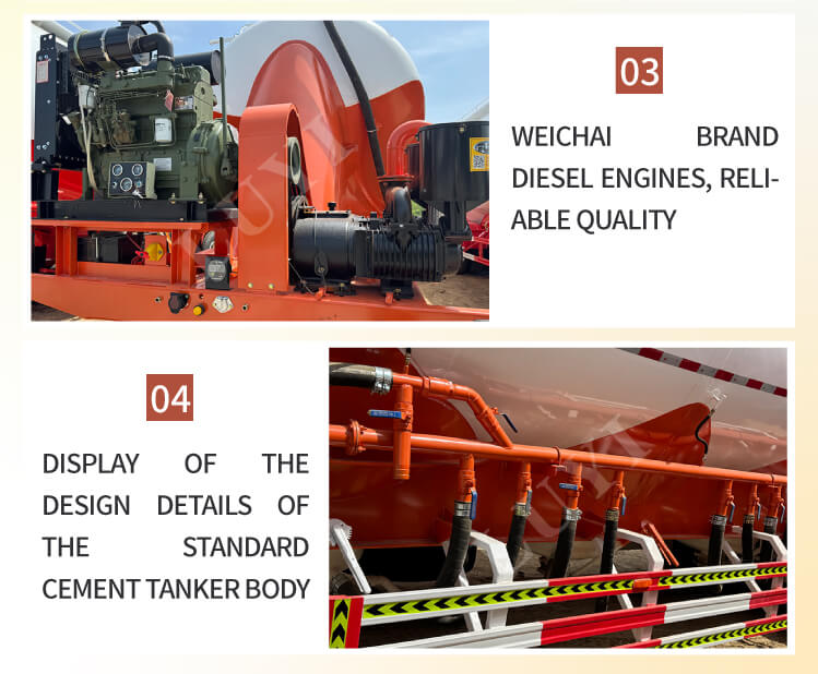 Der aus hochwertigem Stahl gefertigte Anhänger verwendet 16#-Kanalstahl für die Seitenträger, was eine robuste und langlebige Struktur gewährleistet. Seine maximale Nutzlast beträgt mehr als 30.000 kg und die Ladekapazität reicht von 30 bis 60 Tonnen, sodass er problemlos den Anforderungen unterschiedlicher Transportvolumina gerecht wird. Ausgestattet mit einer 3-Achs-Struktur, 12R22,5-Reifen und 9,00-22,5-Felgen, gepaart mit einer mechanischen Luftfederung sorgt es für stabiles Fahren und passt sich verschiedenen Straßenverhältnissen an. Das serienmäßige 28-Tonnen-Fahrwerk garantiert festen Halt beim Parken. Darüber hinaus verfügt es über eine 6-jährige Garantiezeit, die Nutzungsbedenken umfassend reduziert und eine zuverlässige und langfristige Geräteunterstützung für den Massentransport von Zementpulver bietet