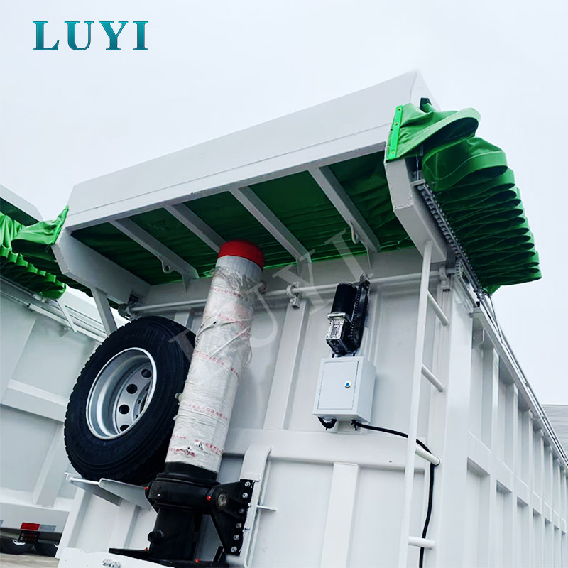 Der weiße 3-Achs-Heckkipp-Kippauflieger der Marke LUYI, der aus einer hochwertigen Fertigung in Shandong, China, stammt, ist ein effizienter LKW-Anhänger, der speziell für den Schwerlasttransport entwickelt wurde. Das Produkt besteht aus hochfestem Stahl und zeichnet sich durch eine stabile und langlebige Struktur aus. Es hat Abmessungen von 1300 mm × 2500 mm × 4000 mm und eine maximale Tragfähigkeit von 100 Tonnen und erfüllt problemlos die Transportanforderungen verschiedener schwerer Güter.