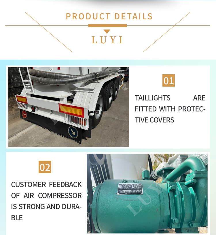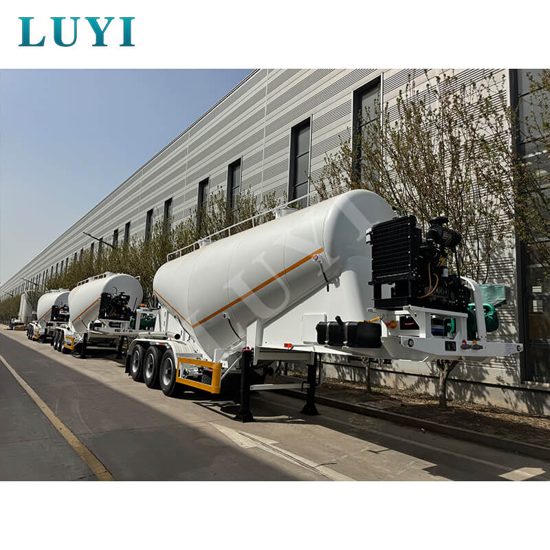 Der dreiachsige 30-60-Kubikmeter-Zementtanker von LUYI, auch als Pulvertankwagen bekannt, stammt aus der Provinz Shandong, China. Es handelt sich um einen hocheffizienten Sattelauflieger, der speziell für den Transport von Massenzementpulver entwickelt wurde und die Anforderungen von Frachttransportszenarien genau erfüllt.