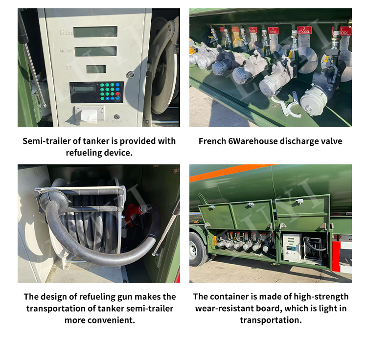 Ausgestattet mit 13/16-Tonnen-Fuwa/BPW/CIMC-Achsen und 12r22,5-Reifen bietet er zwei Federungsoptionen: mechanische oder Luftfederung und verfügt über eine beeindruckende maximale Ladekapazität von 56.000 l. Das Fahrzeug ist mit einem 28-Tonnen-Fahrwerk, einem 50#- oder 90#-Königszapfen und einem Zweileitungsbremssystem ausgestattet, um die Fahrsicherheit zu gewährleisten.