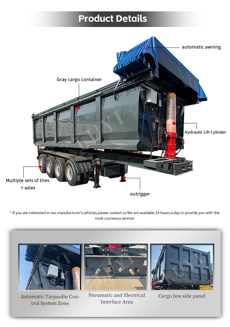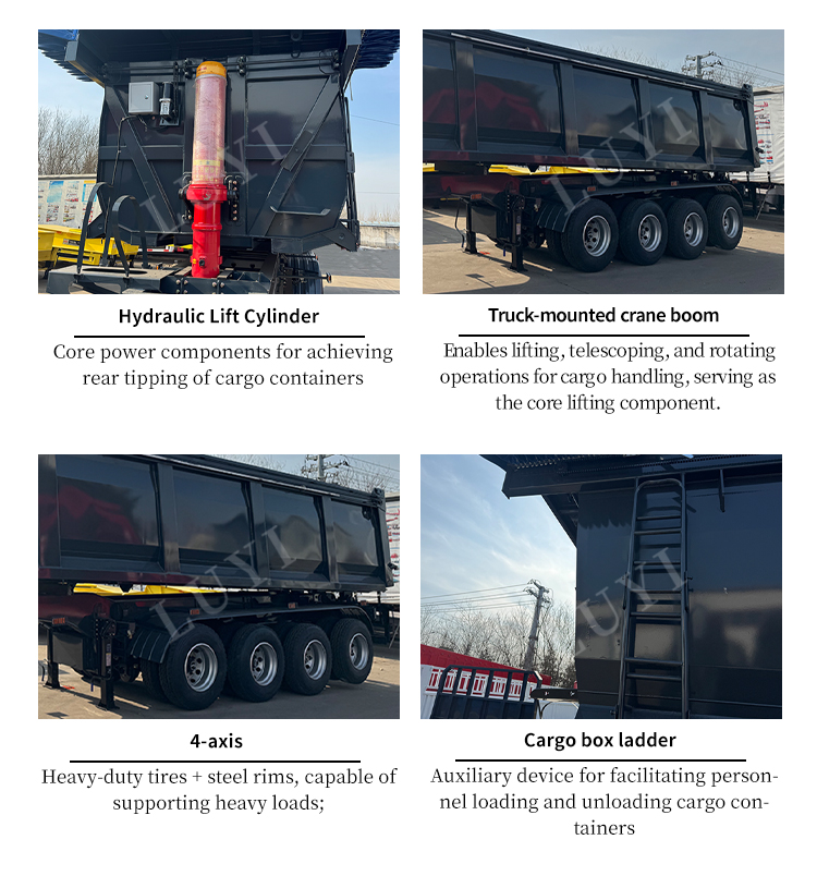 Die Konstruktion besteht aus Radnaben aus Q345-Kohlenstoffstahl mit einer Höhe von 500 mm und verstärkten Hauptträgern mit einer Tragfähigkeit von 70 Tonnen und sorgt für hohe strukturelle Stabilität und lange Lebensdauer. Ausgestattet mit optionalen 4/6 Achsen, passenden mechanischen Feder- oder Luftfederungssystemen und Multi-Spec-Reifen, einschließlich 11.00R20, 12R20 und 315/80R22.5, läuft es stabil auf unterschiedlichen, komplexen Straßenbedingungen. Der über einen Hydraulikzylinder angetriebene U-förmige Kippaufbau ermöglicht ein schnelles und effizientes Entladen. Anpassbare Farben sind erhältlich, um unterschiedlichen Kundenanforderungen gerecht zu werden, was es zu einem zuverlässigen und langlebigen Schwertransportgerät für Schüttgüter wie Sand, Kies und Kohle macht.