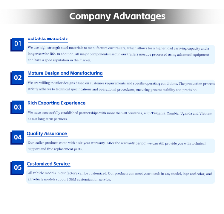 Senden Sie uns Ihre Anfrage, um ein individuelles Angebot basierend auf Ihren tatsächlichen Transportanforderungen zu erhalten. Teilen Sie uns den Anhängertyp, die Ladung bzw. Nutzlast, die Straßenverhältnisse, das Ziel und die Menge mit, und unser Team wird Ihnen so schnell wie möglich eine passende Empfehlung unterbreiten.