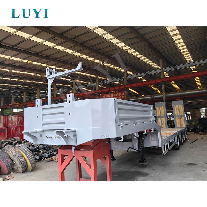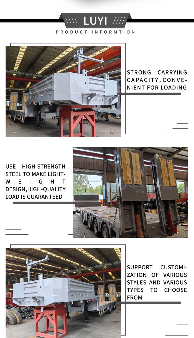 Die Abmessungen des Anhängers sind anpassbar und er bietet 2/3/4-Achsen-Optionen. Ausgestattet mit einem Luftfederungssystem und 12R22,5-Reifen sorgt es für sanftes und komfortables Fahren. Die serienmäßigen 28-Tonnen-Stützbeine sorgen für zuverlässigen Halt, während die Zweileitungs-Bremsanlage für Fahrsicherheit sorgt. Die Felgenspezifikationen lauten 8,0/9,0×8/12/16 Stück und der Achsschenkelbolzen verfügt über 2 Zoll (50 mm) oder 3,5 Zoll (90 mm) JOST-Optionen für eine starke Anpassungsfähigkeit. Kunden können die Farbe wählen und dabei Funktionalität und Personalisierung in Einklang bringen, was es zur idealen Wahl für einen effizienten Transport macht.