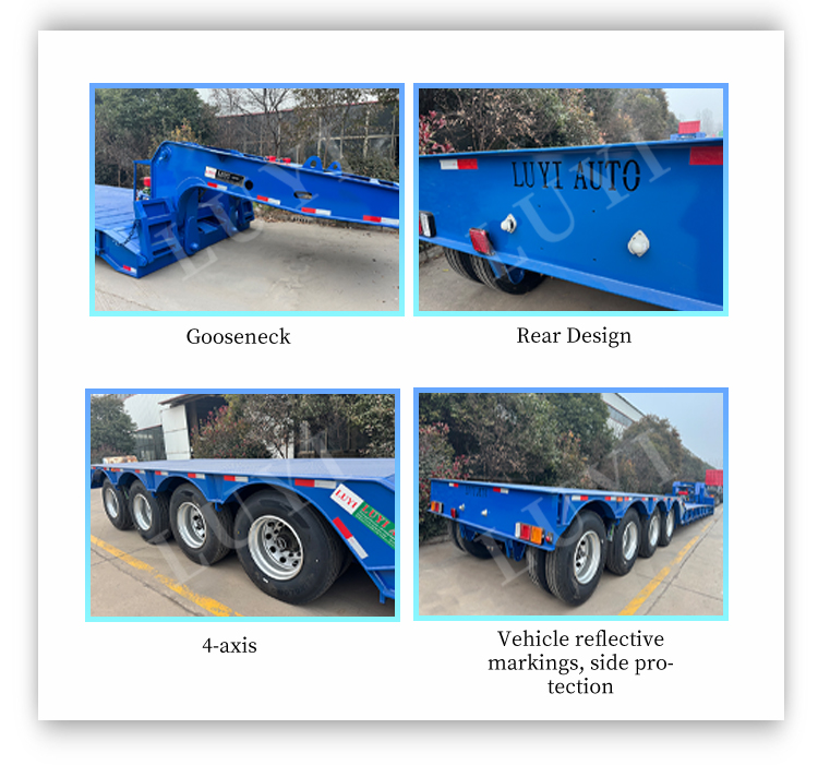Der aus Shandong, China, stammende 4-Achs-Schwanenhals-Tiefbett-Sattelauflieger LUYI ist ein hochwertiger Sattelauflieger, der speziell für den Schwerlasttransport entwickelt wurde. Er besteht aus hochwertigem Stahl und hat ein Eigengewicht von nur 6.350 kg, eine Nenntragfähigkeit von 50.000 kg und eine maximale Nutzlast von 30 t bis 200 t, was eine außergewöhnliche Tragfähigkeit bietet.
