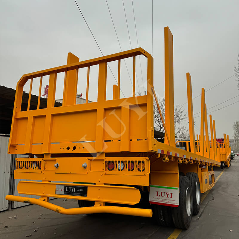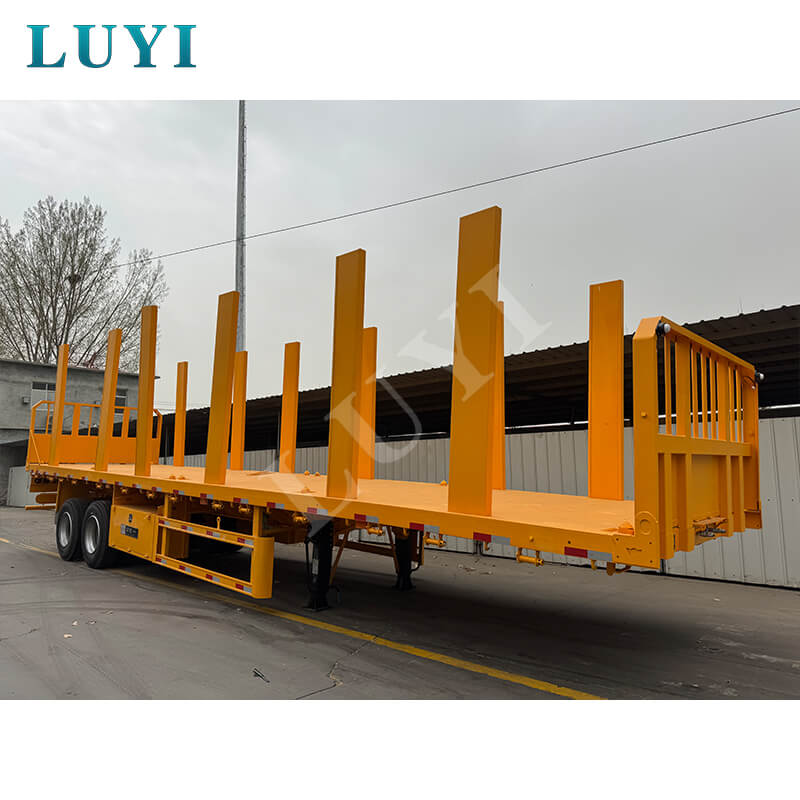 Der zweiachsige 40-Tonnen-Säulen-Pritschenanhänger von LUYI ist auf den Holztransport zugeschnitten und verfügt über umfangreiche Anpassungsmöglichkeiten. Passen Sie die Höhe des Sideboards an (30–80 cm verfügbar), um es an Baumstämme, Bauholz oder andere Holzprodukte anzupassen, und wählen Sie zwischen Riffelblech-Stahldecks oder rutschfest beschichteten Decks für besseren Halt.