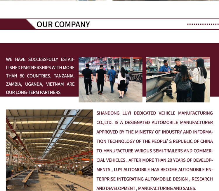 Luyi Semi Trailer Manufacturing Co., LTD ist auf die Herstellung aller Arten von Sattelaufliegern spezialisiert: Zementtankwagen, Öltankwagen, Kippauflieger, Containerauflieger, Flachwandauflieger, Skelettauflieger, Scheunenauflieger, Tieflader