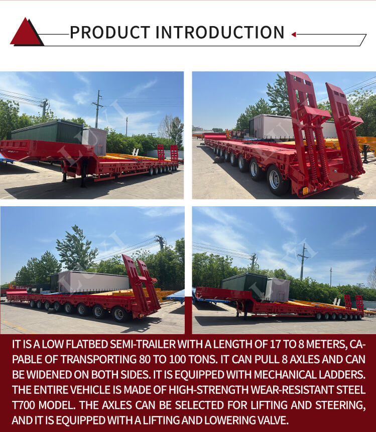 Er ist aus hochwertigem Kohlenstoffstahl oder Aluminium gefertigt und bietet ein ausgewogenes Verhältnis zwischen Haltbarkeit und geringem Gewicht. Er verfügt über eine maximale Nutzlast von 100 Tonnen, um verschiedene Transportszenarien für schweres Gerät problemlos zu bewältigen. Ausgestattet mit einer 8-Achsen-Konstruktion bietet er optional Achsen der Marken Fuwa oder BPW, gepaart mit mechanischen Federungs- oder Luftfederungssystemen, um Fahrstabilität und Ladungssicherheit zu gewährleisten. Es stehen drei Reifenspezifikationen zur Verfügung: 12R22.5, 12.00R20 und 11R22.5, geeignet für unterschiedliche Straßenbedingungen.