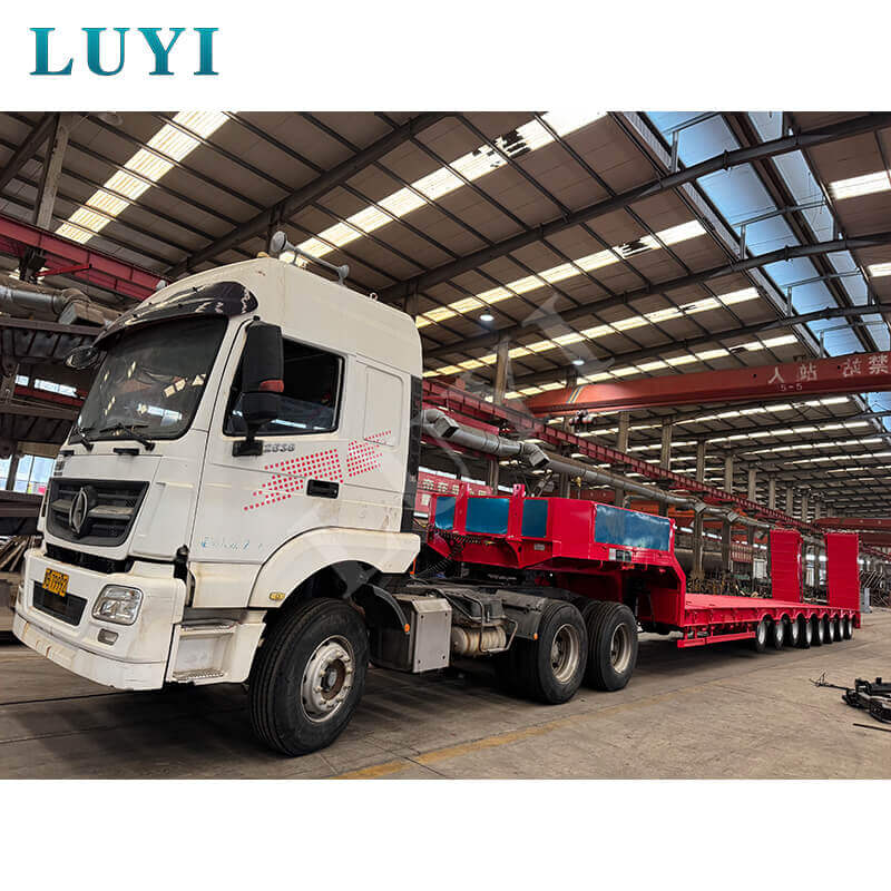 Er ist mit 13/16-Tonnen-Achsen renommierter Marken wie Fuhua, BPW oder CIMC ausgestattet, gepaart mit Reifen der Modelle 11.00r20, 12r22.5, 315 und 385 für stabiles Fahren. Das Federungssystem verfügt über mechanische Federn und das Bremssystem verfügt über eine Zweileitungskonstruktion, die eine hervorragende Sicherheitsleistung gewährleistet. Der Achsschenkelbolzen bietet zwei Spezifikationen: 2,0 Zoll (50 mm) und 3,5 Zoll (90 mm). Die Stützbeine sind von der Marke JOST D200T mit einer Standardtragfähigkeit von 28 Tonnen und passen sich unterschiedlichen Traktionsanforderungen und Be- und Entladeszenarien an. Die Farbe kann je nach Kundenwunsch angepasst werden und bietet so eine zuverlässige und flexible Lösung für den Transport verschiedener schwerer Geräte.