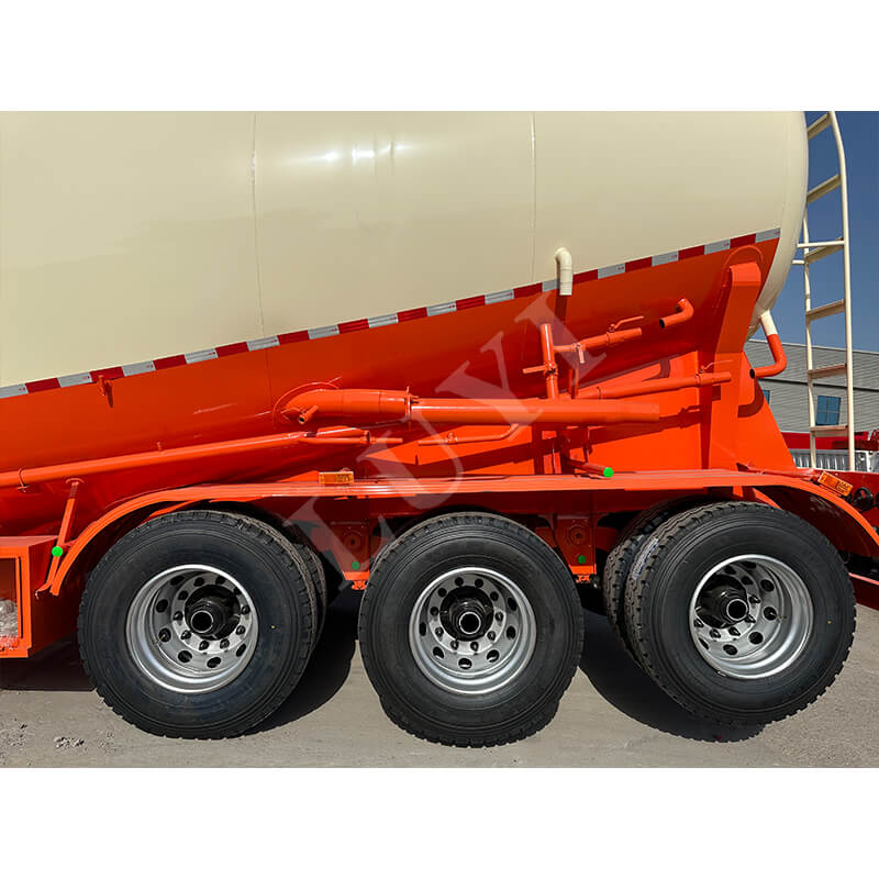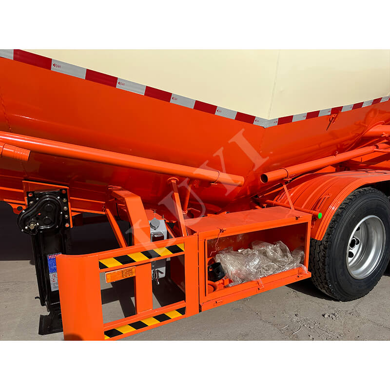 Die Abmessungen des Anhängers betragen 10500×2550×4000 mm. Er ist mit zwei Optionen mechanischer/Luftfederung ausgestattet, gepaart mit einer stabilen 3-Achsen-Struktur und 28-Tonnen-Schwerlastabstützungen, um Stabilität beim Parken und Fahren zu gewährleisten. Das Zweileitungsbremssystem erhöht die Sicherheit. Zu den Reifenoptionen gehören verschiedene Spezifikationen wie 11.00r20 und 12r22.5, und der Achsschenkelbolzen ist in zwei Modellen erhältlich: JOST 50 mm / 90 mm. Darüber hinaus kann die Farbe je nach Bedarf angepasst werden und passt sich somit vollständig an unterschiedliche Transportszenarien und ästhetische Anforderungen an, was es zu einer zuverlässigen Ausrüstung für den Massentransport von Zement macht.
