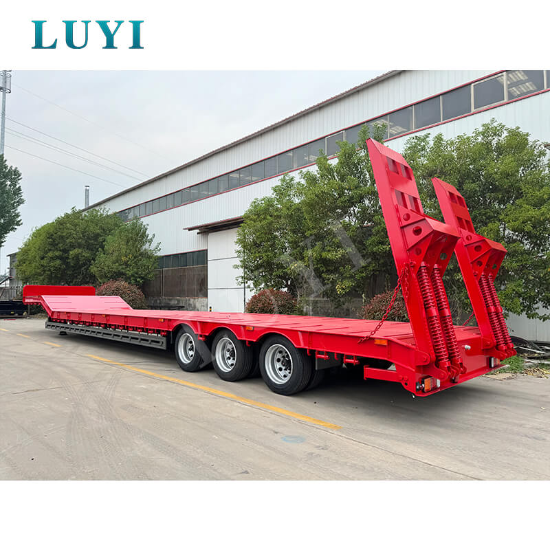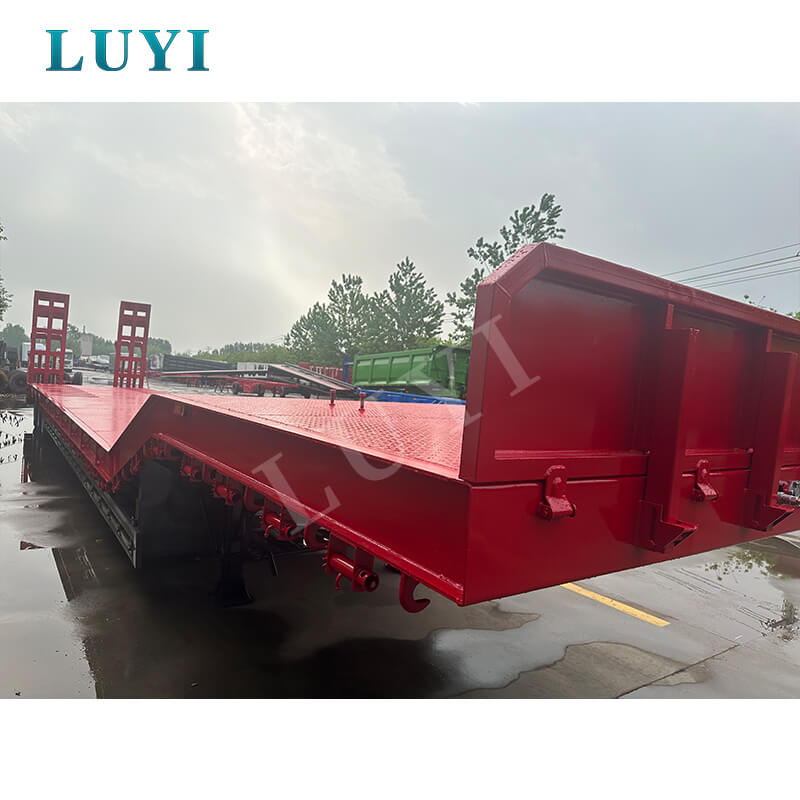 Der dreiachsige 80-Tonnen-Tieflader-Sattelauflieger mit niedrigem Fahrgestell von LUYI, ein brandneues Schwerlasttransportfahrzeug aus Shandong, China, ist maßgeschneidert für den Transport schwerer Geräte.