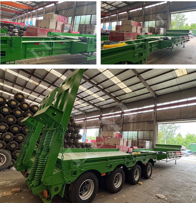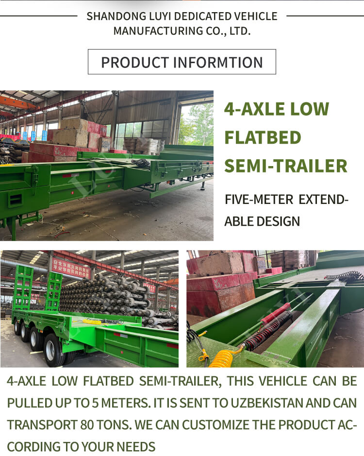 Der 4-Achs-60T-Schwanenhals-Tiefbett-Sattelauflieger LUYI, ein hochwertiges Schwerlasttransportfahrzeug aus Shandong, China, ist auf den Transport schwerer Geräte zugeschnitten. Er ist aus hochwertigem Stahl gefertigt, verfügt über Abmessungen von 22.000 x 3.000 x 1.600 mm und eine maximale Nutzlast von 60 Tonnen und bewältigt problemlos den Transport verschiedener schwerer Maschinen.