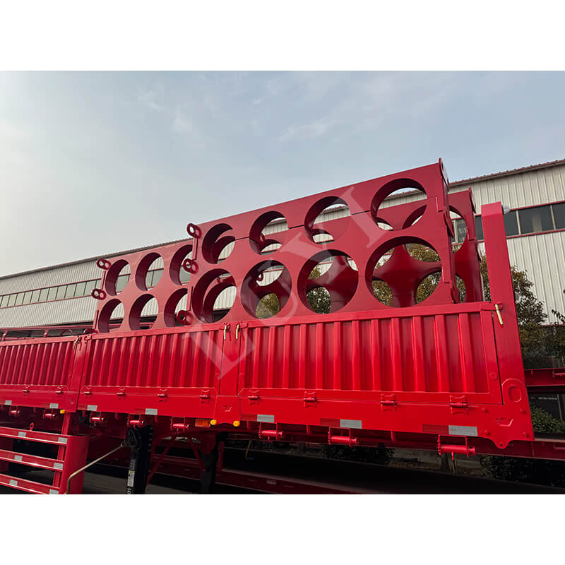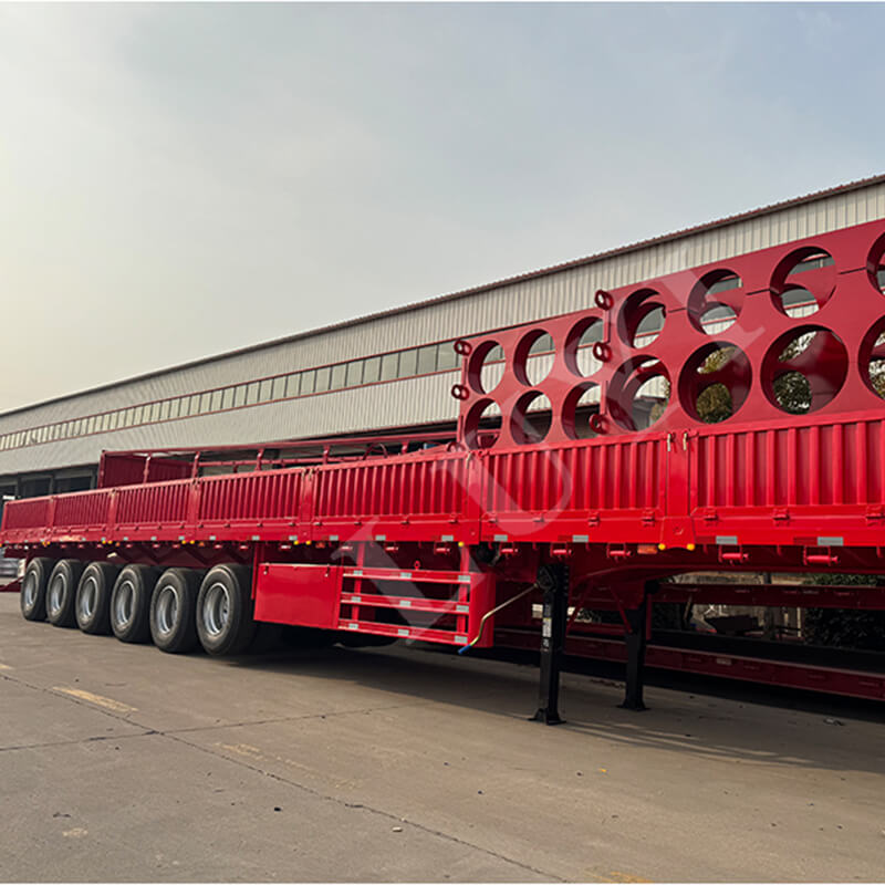 Der 6-Achser 15,5 m 80-100 Tonnen 40 Fuß Seitenwand-Sattelauflieger von LUYI, auch Rungen-/Pritschen-Sattelauflieger genannt, stammt aus Shandong, China. Es handelt sich um einen hochwertigen Sattelauflieger, der für den Transport von Containern und Massengütern konzipiert ist. Er ist vollständig aus Stahl gefertigt, misst 15.500 x 2.500 x 1.600 mm und verfügt über eine maximale effektive Nutzlast von 60–100 Tonnen. Er verfügt über eine starke Tragfähigkeit, um den Transportanforderungen schwerer Güter problemlos gerecht zu werden.