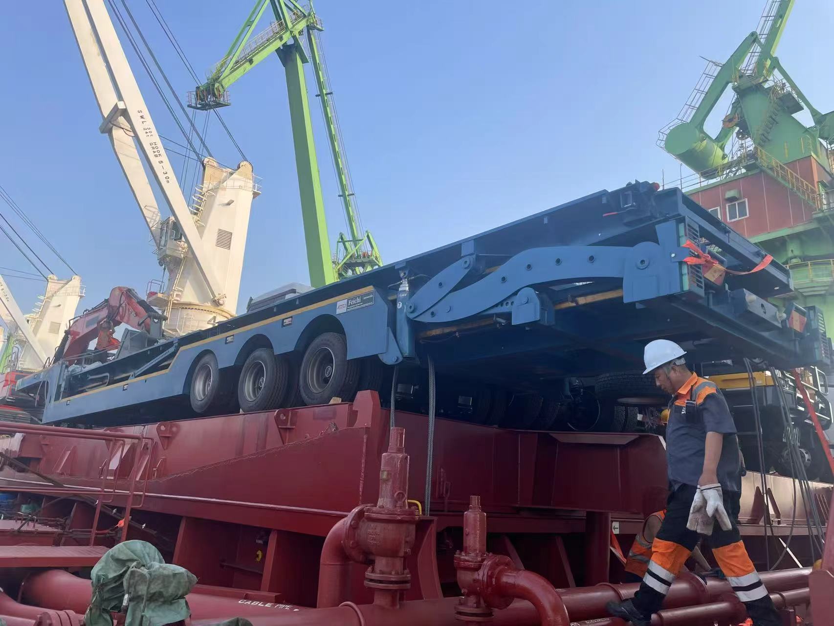 Im Frühherbst herrschte in einem internationalen Hafen in der Provinz Shandong reges Treiben. Dutzende von Luyi3-Achs-4-Fuß-Tieflader-Aufliegerwurden geordnet am Terminal geparkt. Nach mehreren Verfahren wie Zollkontrolle und Sicherheitsverstärkung wurden die Tieflader-Sattelauflieger mit professioneller Hebeausrüstung langsam in den Frachtraum eines Seefrachters gehoben. Dieser Ladevorgang markierte den offiziellen Start der grenzüberschreitenden Transportkooperation zwischen der Marke Luyi und kasachischen Kunden. Die dreiachsigen 4-Fuß-Tieflader-Auflieger von Luyi werden nationale Grenzen überschreiten, um Schwerlastlösungen für den technischen Transportsektor in Kasachstan bereitzustellen.