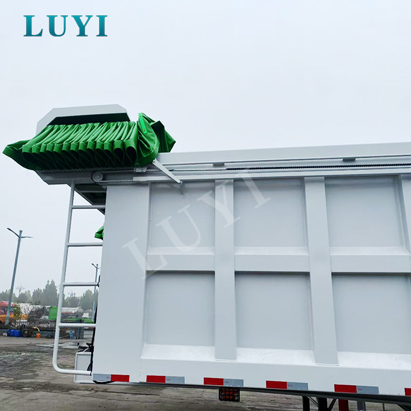 Der weiße 3-Achs-Heckkipp-Kippauflieger der Marke LUYI, der aus einer hochwertigen Fertigung in Shandong, China, stammt, ist ein effizienter LKW-Anhänger, der speziell für den Schwerlasttransport entwickelt wurde. Das Produkt besteht aus hochfestem Stahl und zeichnet sich durch eine stabile und langlebige Struktur aus. Es hat Abmessungen von 1300 mm × 2500 mm × 4000 mm und eine maximale Tragfähigkeit von 100 Tonnen und erfüllt problemlos die Transportanforderungen verschiedener schwerer Güter.
